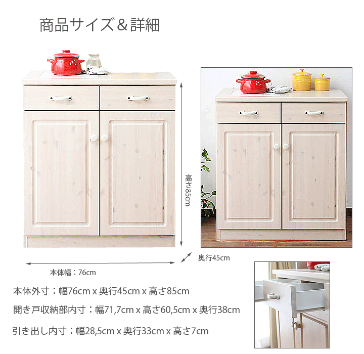 商品詳細説明 サイズ[本体]幅:76cm ×奥行き:45cm ×高さ:85cmカラー/色パイン材/自然色、アイボリー系ホワイト(ウレタン塗装色)テイストコンパクト/シンプル/カジュアル/おしゃれ/カントリー/北欧風デザイン設置お部屋ダイニングルーム/キッチンルーム 材質全体:北欧産パイン材/ホワイト系ウレタン塗装/開き戸・引き出し:セラミック製取っ手/引き出し内部白化粧板仕様製造国日本(福岡県大川市)国産品セールスポイントコンパクト・スリムサイズで場所をとりません。