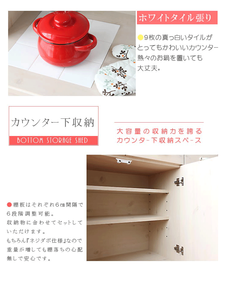 ホワイトタイル貼り天板が可愛いパイン材使用の天然無垢キッチンカウンター 送料無料・組み立て不要 完成品!届いたその日から直ぐにご使用頂けます。